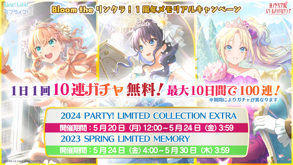 おかげさまで、スマートフォンアプリ「Link!Like!ラブライブ!」(以下、「リンクラ」)は2024年5月20日(月)で1周年を迎えました。日頃より「リンクラ」をプレイいただいております皆様に感謝の気持ちを込め、様々なキャンペーンを開催いたします!また、蓮ノ空女学院スクールアイドルクラブの公式YouTubeチャンネル及び公式X(旧Twitter)においても様々な企画を開催いたします。