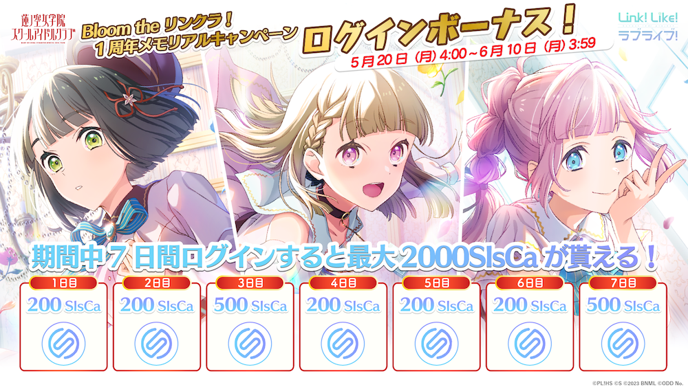 期間中「リンクラ」に合計7日間ログインしていただくことで、無償SIsCaを最大で2,000 SIsCaプレゼントいたします。